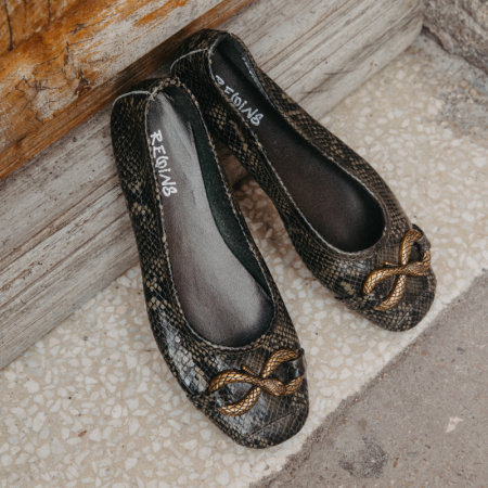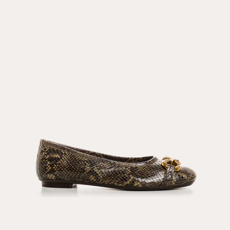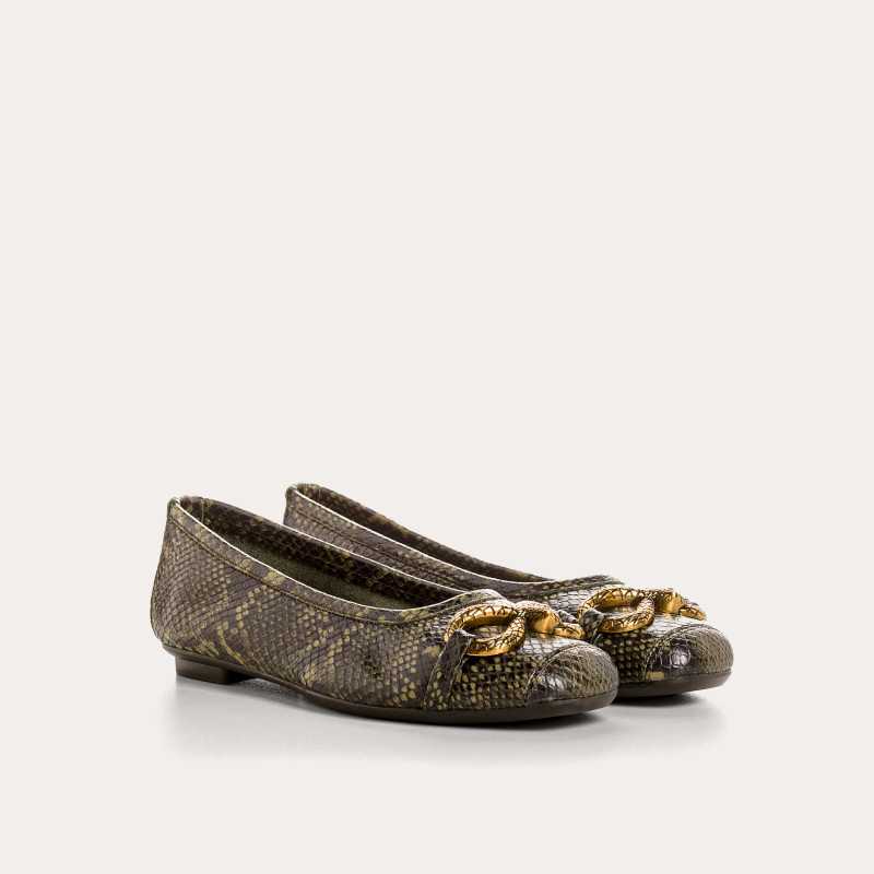 Les ballerines Heve Python revisitent le mocassin avec élégance et originalité. En cuir embossé effet serpent, elles affichent un motif python chic et naturel, rehaussé d’un bijou doré lumineux. Leur semelle plate (talon <1 cm) assure confort et souplesse, tandis que la semelle intérieure en cuir garantit un accueil agréable. Faciles à porter, elles twistent jean, robe fluide ou pantalon droit