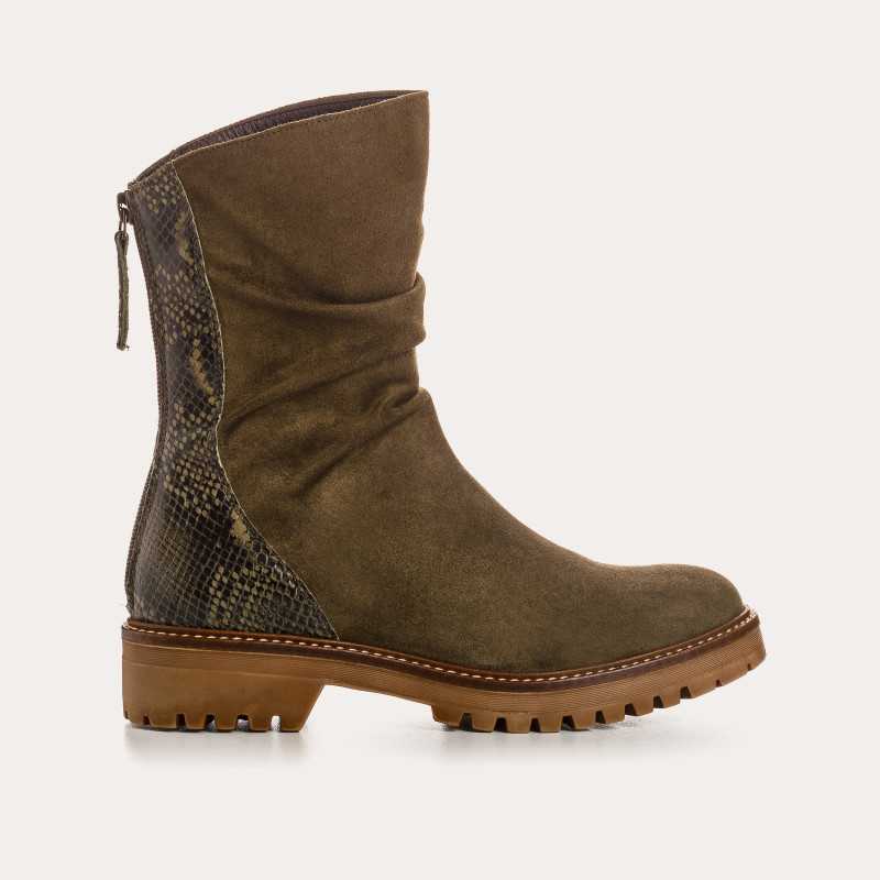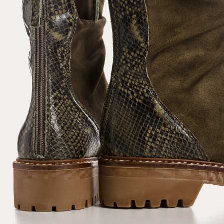 Audacieuses et affirmées, les bottes Dunk en cuir suédé kaki à imprimé python affichent une allure sauvage et contemporaine. Leur tige plissée de 16 cm apporte volume et mouvement, soulignant le caractère unique du modèle. Montées sur une semelle crantée et un talon de 3,5 cm, elles offrent style et confort. Avec leur fermeture éclair, elles se portent facilement avec robe fluide, jean slim ou jupe midi.