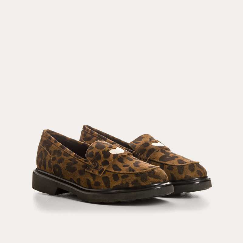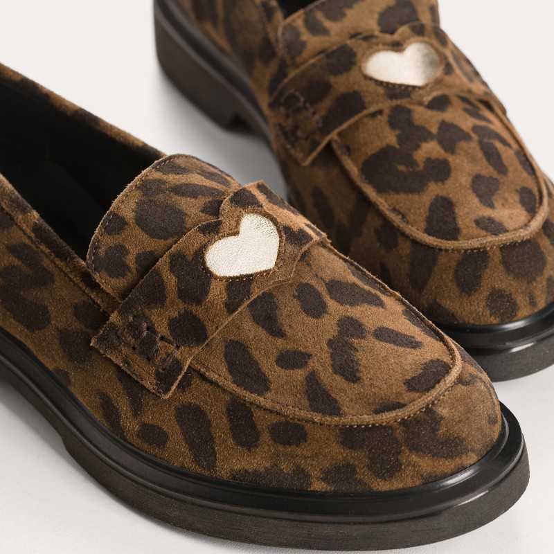 Les mocassins Jack revisitent l’esprit collège avec une fantaisie assumée. En cuir suédé imprimé serval vison, ils s’ornent d’un cœur doré sur la languette pour une allure espiègle et élégante. Leur talon de 2,5 cm allie confort et style. À porter avec un jean retroussé, une jupe plissée ou un pantalon droit pour un look preppy revisité et plein de personnalité.
