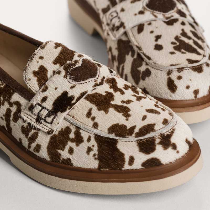 Une silhouette raffinée se dessine avec les mocassins Jack en cuir imprimé vache. Ce modèle collège orné d'un coeur doré garantit une silhouette authentique et une démarche stable. On aime le caractère de la matière qui réveille un look sobre. Côté look : portez-les avec un pantalon cigarette noir et un trench-coat classique pour un style preppy parisien. Le choix idéal pour une allure soignée en toute occasion.